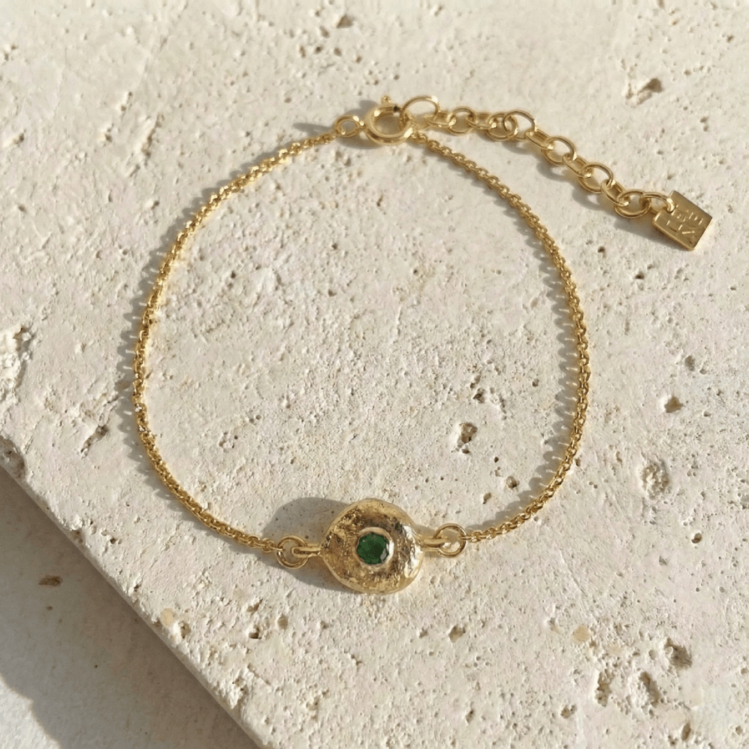 Sublimez votre poignet avec ce bracelet raffiné en argent plaqué or 18 carats, orné d’une tourmaline verte naturelle. Son design minimaliste aux lignes organiques évoque l’élégance brute et la puissance subtile des pierres naturelles.