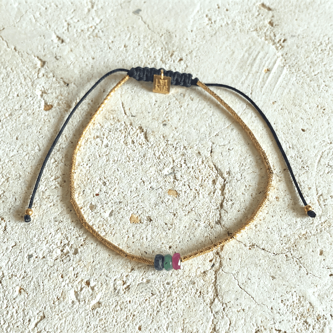 Bracelet tube en argent plaqué or 18 carats émeraude, rubis rouge et saphir bleu ajustable grâce à un cordon noir coulissant.