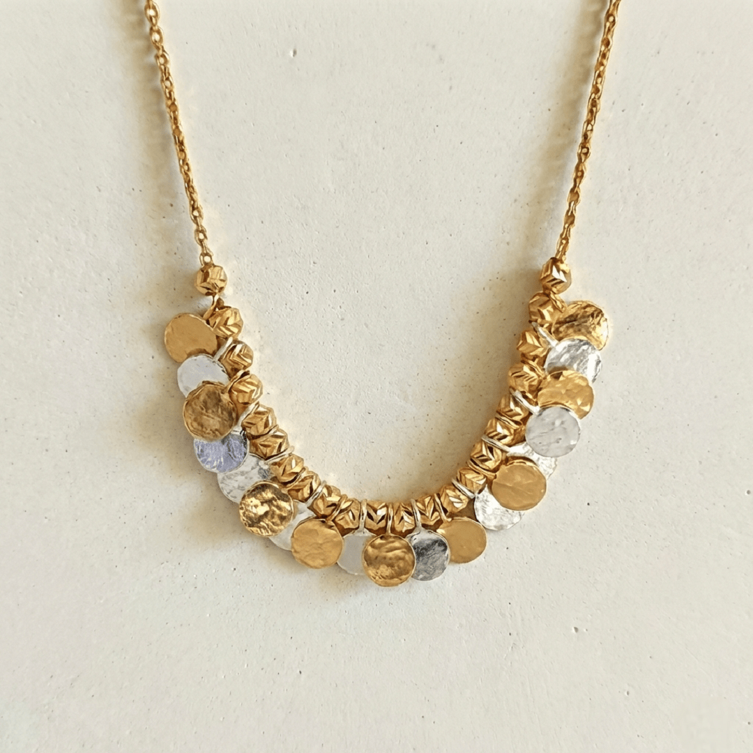 Élégance lumineuse et raffinement artisanal se rencontrent dans le collier Bicolore, alliance subtile d’argent 925 plaqué or 18 carats. Orné de 21 pampilles rondes martelées aux reflets argent et or, il capte la lumière avec grâce et mouvement. Ce collier s’impose comme une pièce incontournable de toute collection de bijoux.