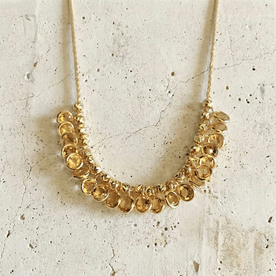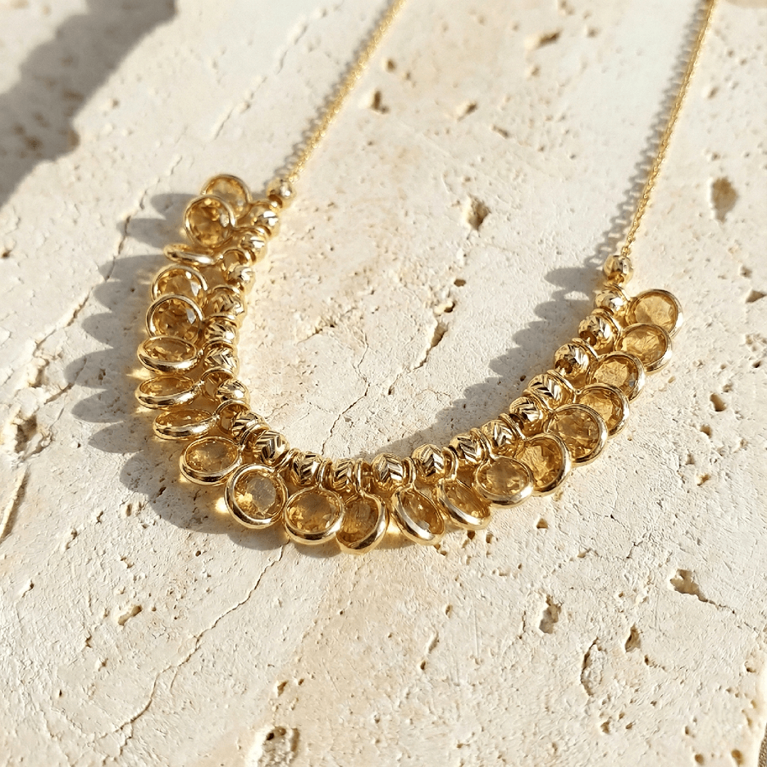 Collier Lou en argent 925 recouvert d’or 18 carats, orné de 21 citrines soigneusement sélectionnées pour leur éclat unique. Ce collier est l’accessoire parfait pour ajouter une touche de sophistication à toutes vos occasions spéciales. Il incarne la beauté intemporelle et l’artisanat de qualité.