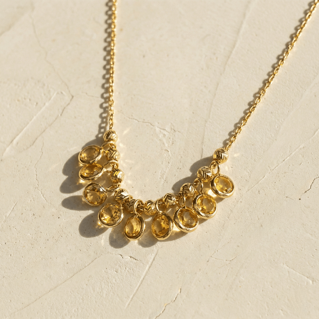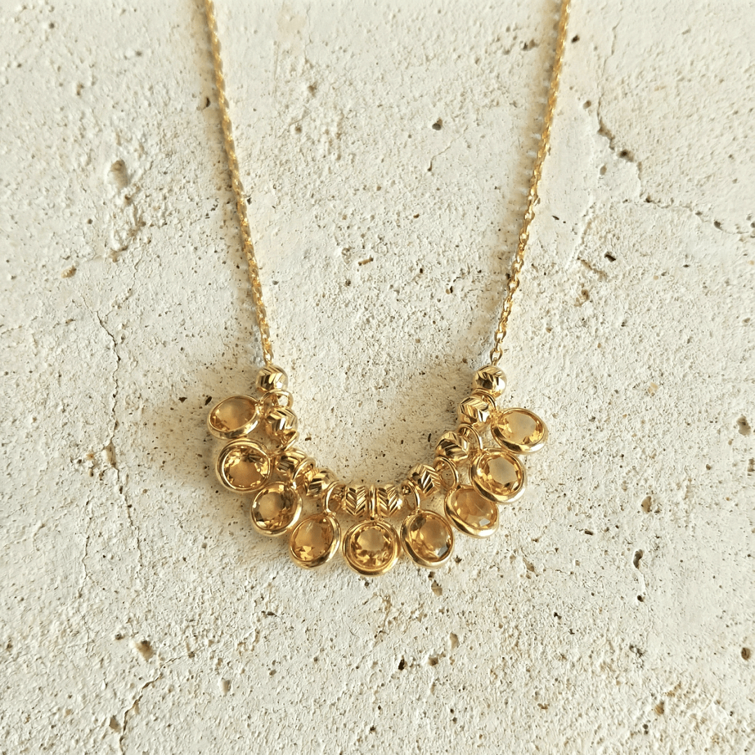 Collier Lou en argent 925 recouvert d’or 18 carats, magnifié par des citrines aux reflets dorés. Un création élégante et lumineuse, parfaite pour sublimer votre style avec une touche sophistiquée et chaleureuse.