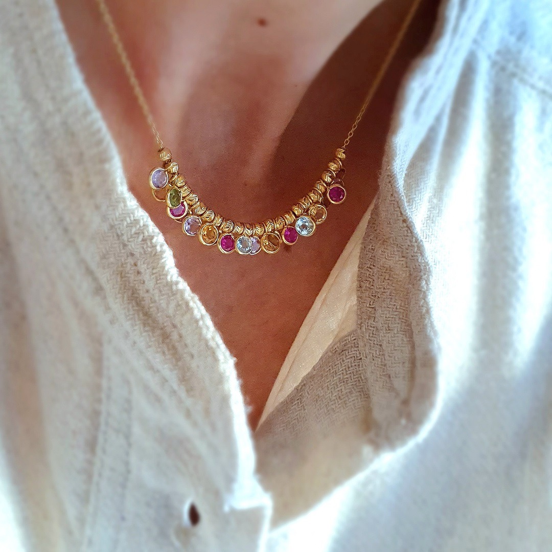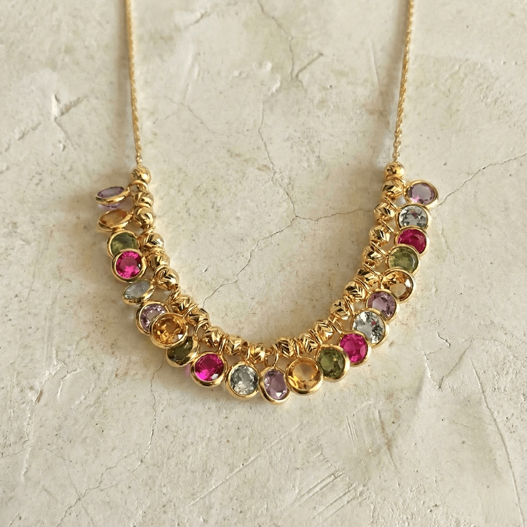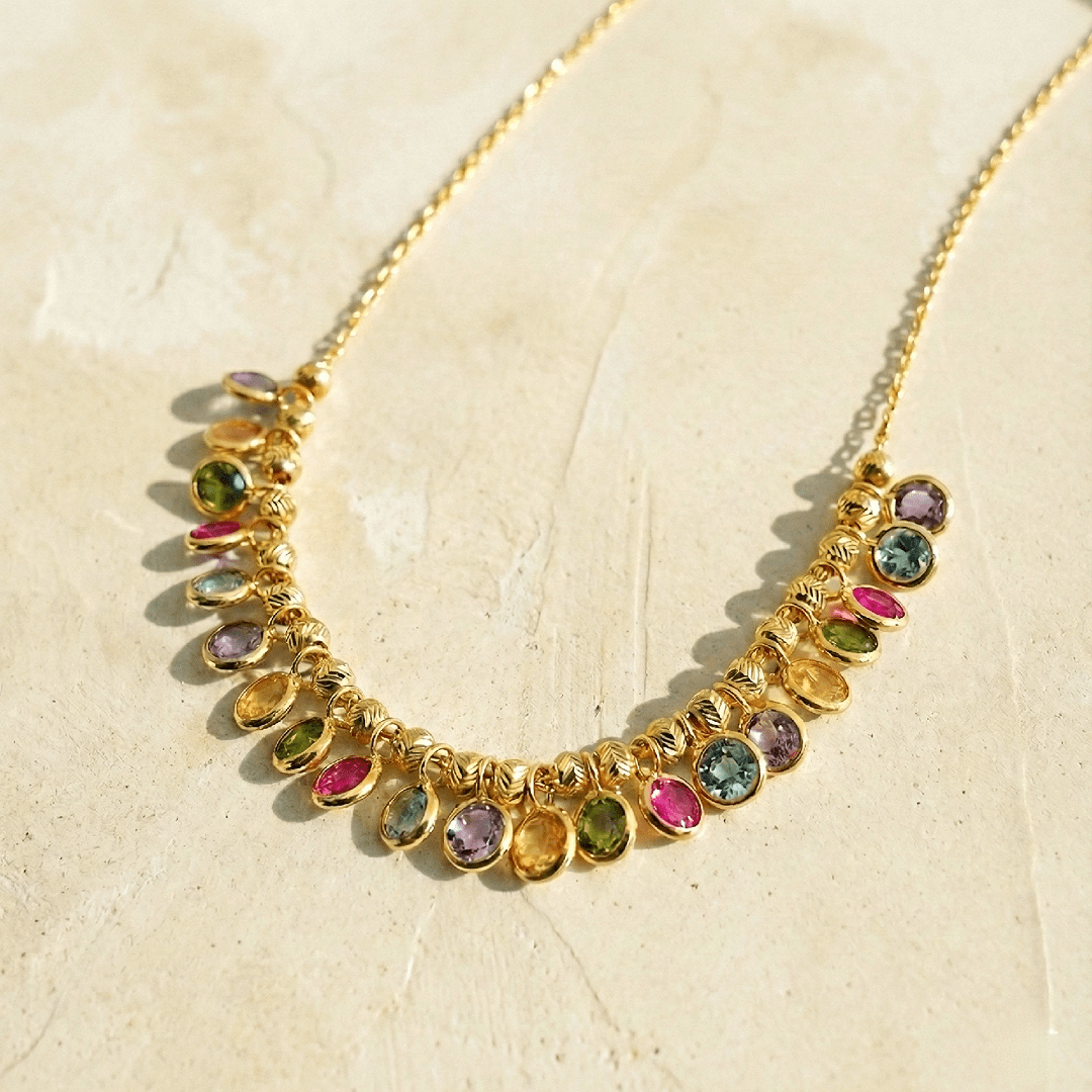 Éclat raffiné et couleurs vibrantes se rencontrent dans ce collier Lou en argent 925, sublimé par un plaquage en or 18 carats. Orné de pierres fines multicolores taillées avec précision, ce bijou d’exception illumine chaque tenue avec élégance. Chaque gemme est soigneusement sertie pour créer une harmonie chromatique délicate et luxueuse.