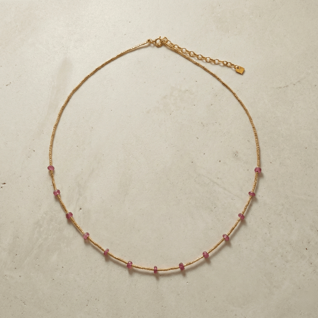 Idéal pour un look quotidien chic ou pour accompagner une tenue de soirée, ce collier doré apporte une touche de féminité et de douceur grâce à la nuance subtile des rubis roses. Son fermoir ajustable permet un port confortable adapté à toutes les morphologies.
