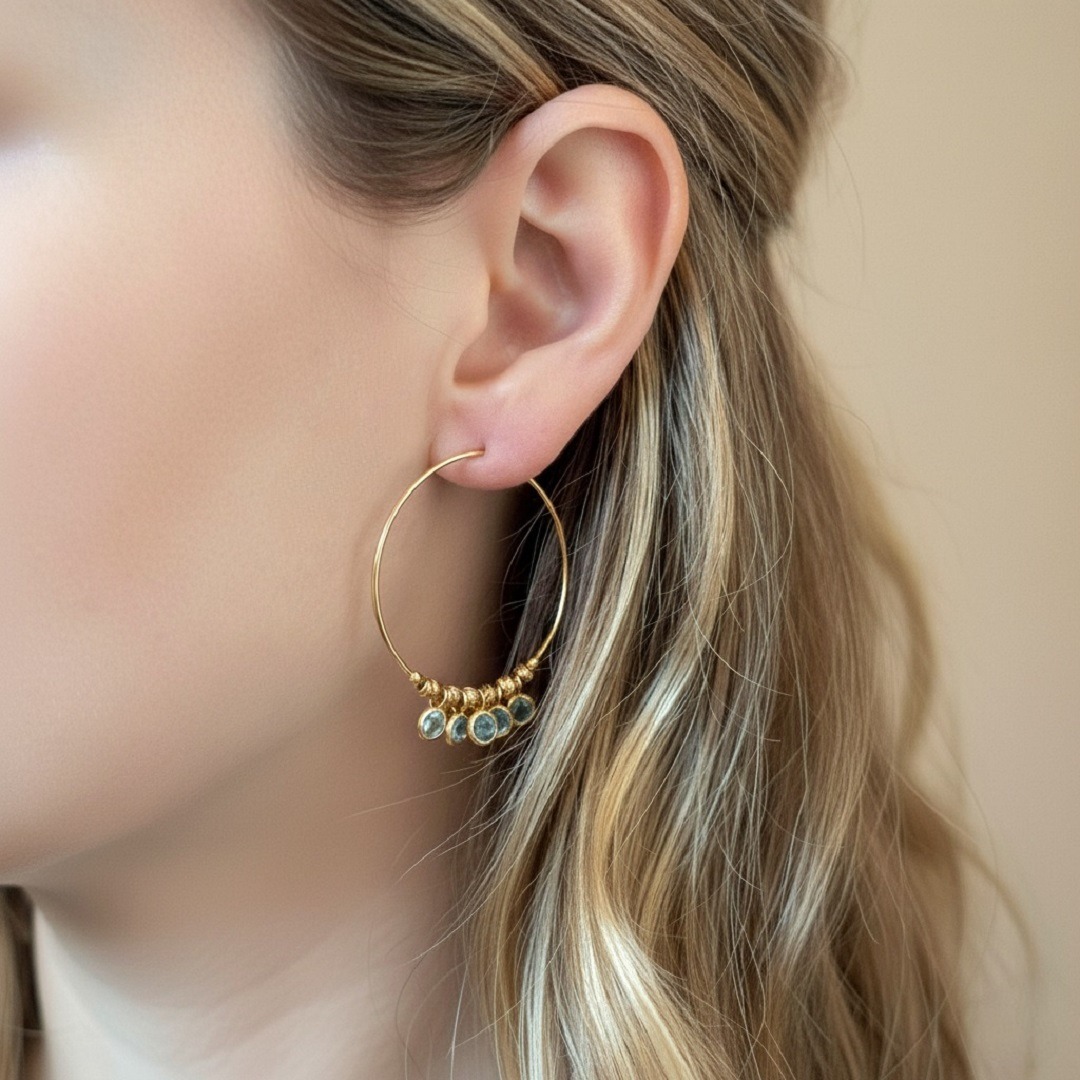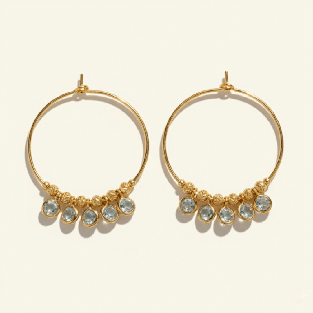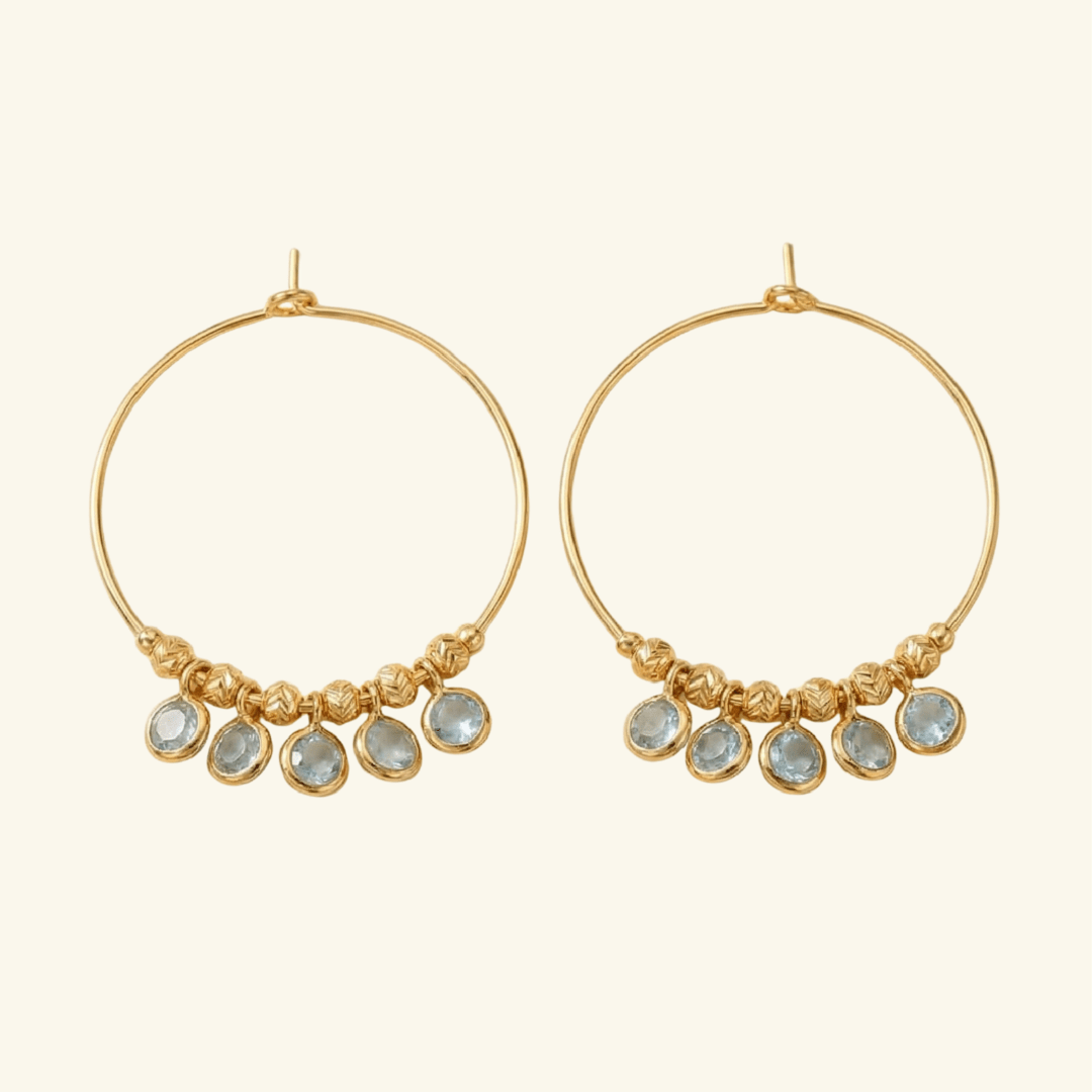 Les créoles Lou en argent 925 plaqué or 18 carats captivent par leur finesse et leur éclat. Ornées de délicates topazes bleues, elles insuffleront une lumière douce à votre silhouette. Légères et aériennes, elles accompagneront chacun de vos gestes avec une grâce subtile, entre modernité et esprit bohème.