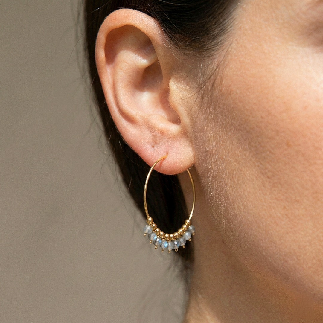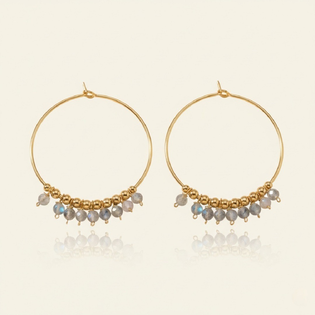 Délicatement façonnées à la main, les créoles Madison en argent 925 plaqué or 18 carats se parent de labradorites aux reflets subtils. Une harmonie parfaite entre finesse, éclat doré et mystère minéral.