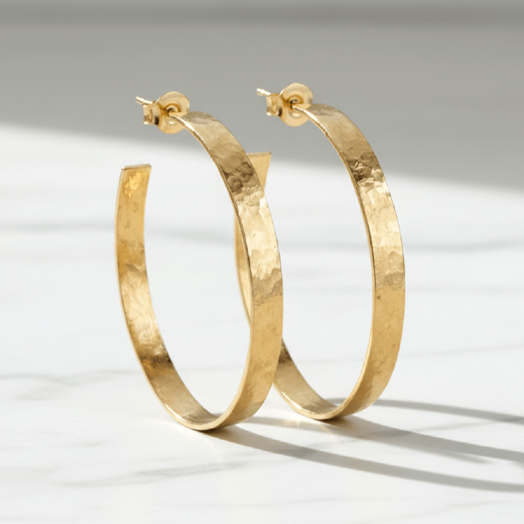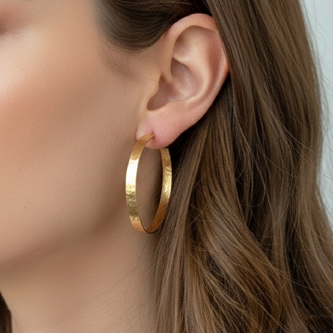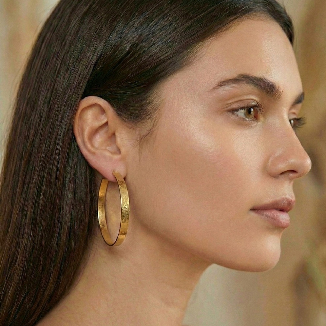 Ces grandes créoles en argent 925 plaqué or 18 carats incarnent l’équilibre parfait entre force et finesse. Leur texture martelée à la main leur confère un éclat irrégulier subtil et raffiné, capturant la lumière à chaque mouvement. Leur forme généreuse mais légère souligne une allure affirmée, intemporelle et féminine.